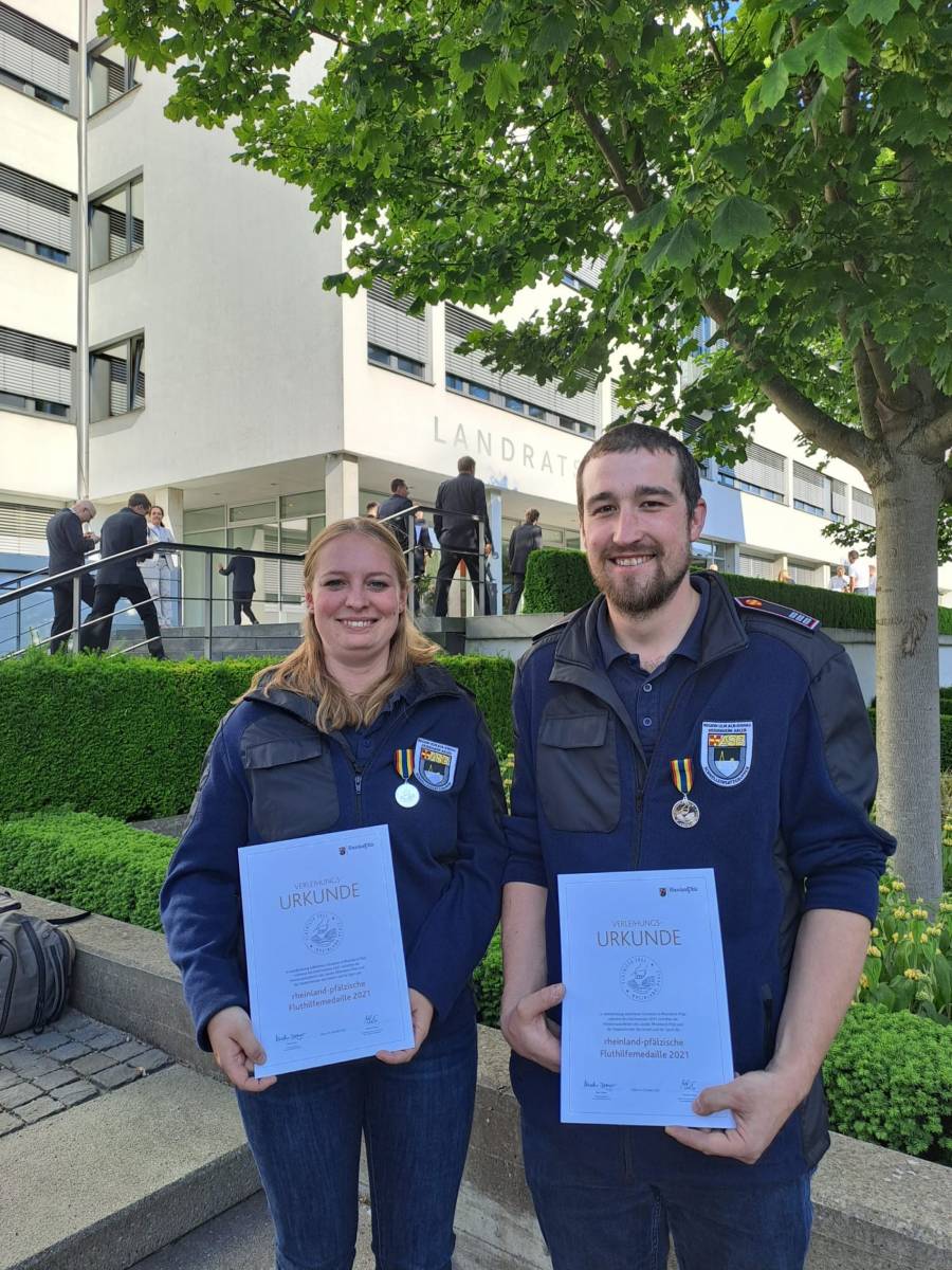 Als Anerkennung für dieses Engagement erhielten Ramona und Tobias Hiller gestern in Biberach im Rahmen einer feierlichen Übergabe die rheinland-pfälzische Fluthelfermedaille.